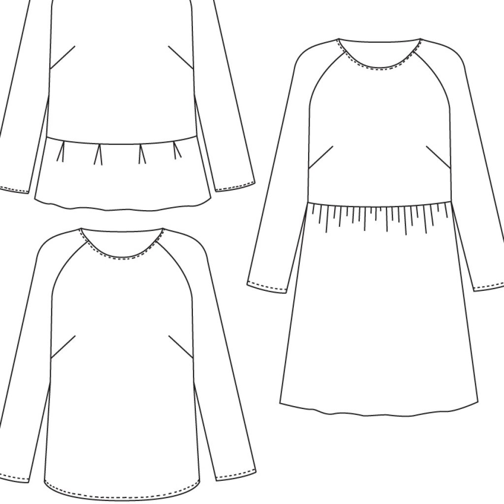 Blouse atemporelle avec manches raglan. Version A : manches 3/4 et basque au bas des manches. Version B : manches longues et basque au bas du top. Également déclinable en robe.