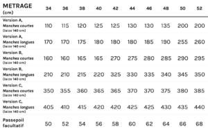 – Ruban élastique de 10 mm de large (pour les versions robe B et C), quantité indiquée dans le tableau ci-contre.