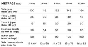 Elastique souple de 15 mm de large, ruban satin de 4 cm de large, toile thermocollante pour tissu fin (voir les quantités nécessaires dans le tableau ci-contre)