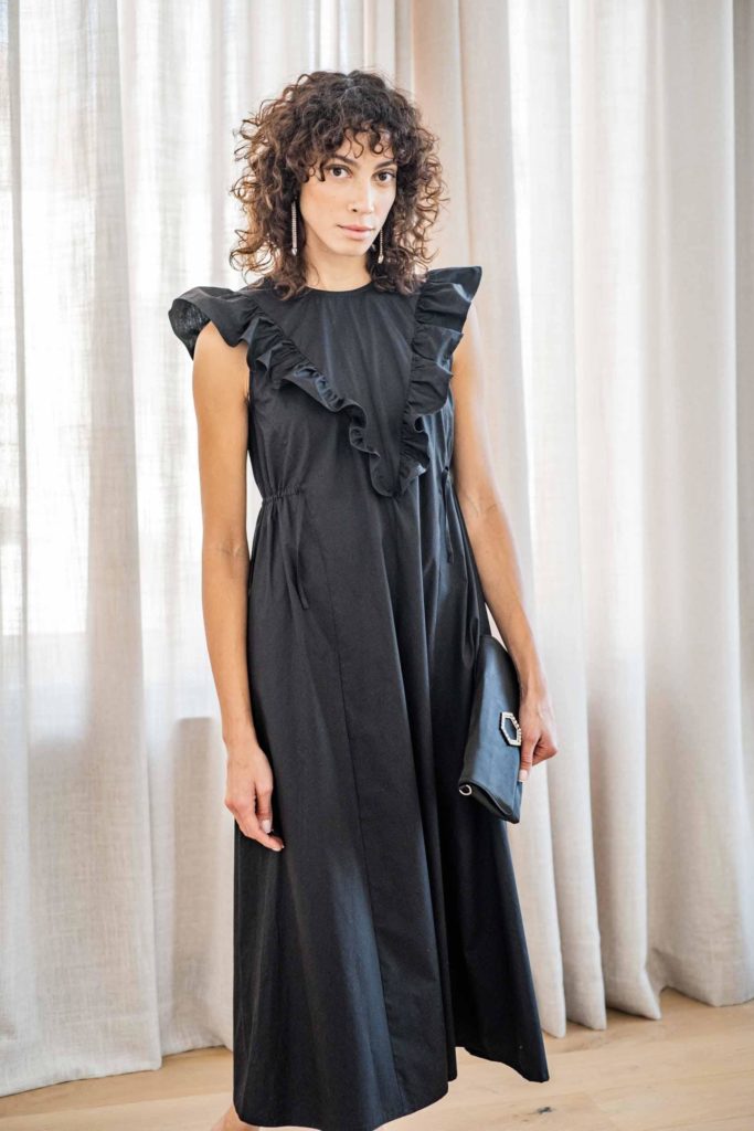 Dans un tissu souple comme une viscose tissée ou un chambray, le volant tombera souplement et le volume sera moins important. Un tissu plus raide (velours milleraies, popeline, broderie anglaise, lyocell = semi-raide) donnera plus « d’ailes » ou de volume au volant.