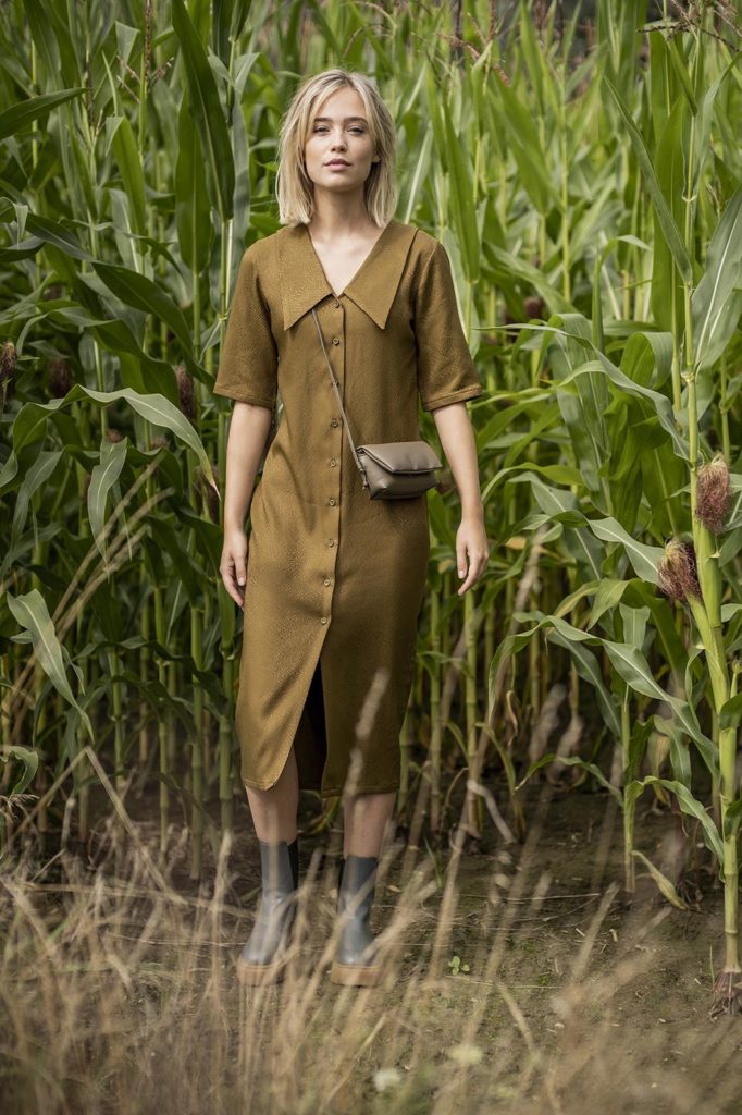 Cette robe chemise sobre avec une fermeture à boutons et des manches courtes toutes simples est fonctionnelle et tendance. Le détail envoûtant de cette robe droite avec une taille douce est le grand col plat appelé aussi col Peter Pan. Vous pouvez l’arranger à votre goût : ajoutez un tissu froncé ou un petit bord en dentelle entre les deux couches du col ou supprimez le col entièrement.