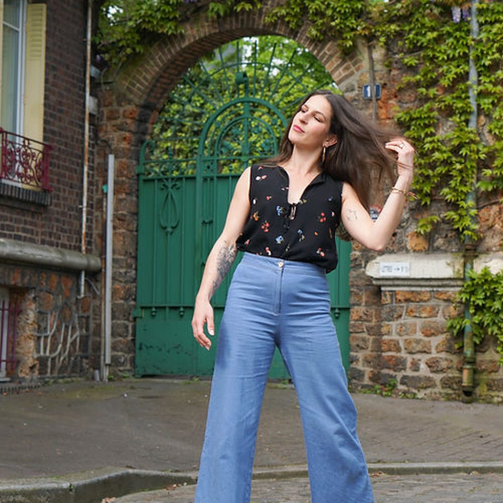 Dans sa version sans manche, je vous conseille de l’associer à un tissu liberty, un pantalon palazzo en chambray et des mules compensées.