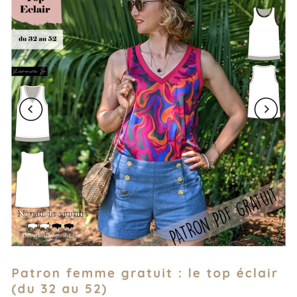 Encolure V ou encolure ronde, finitions galons lurex ou bord côte. Ce top est plus long au dos pour couvrir le haut des fesses juste où il faut ! Il possède une petite fente sur le côté. Attention: les bandes d’encolure et d’emmanchures doivent être obligatoirement coupés dans des matières stretch : jersey, bord côte, galon maille… pour le corps, vous pouvez utilisez des tissus souples et non élastiques : viscose, satin, polyester, double gaz…