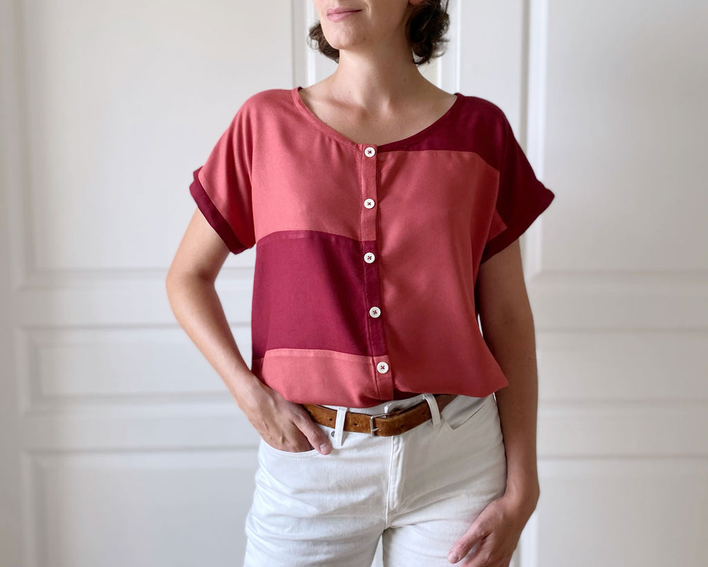 Le top upcycling, classique et minimaliste, vous permettra d’optimiser tous les centimètres carrés de vos chutes de tissus grâce à la technique du patchwork. C’est un patron basique, ultra facile à coudre, même pour des débutantes. Laissez votre créativité et vos chutes de tissus guider le design de votre prochain top upcycling.