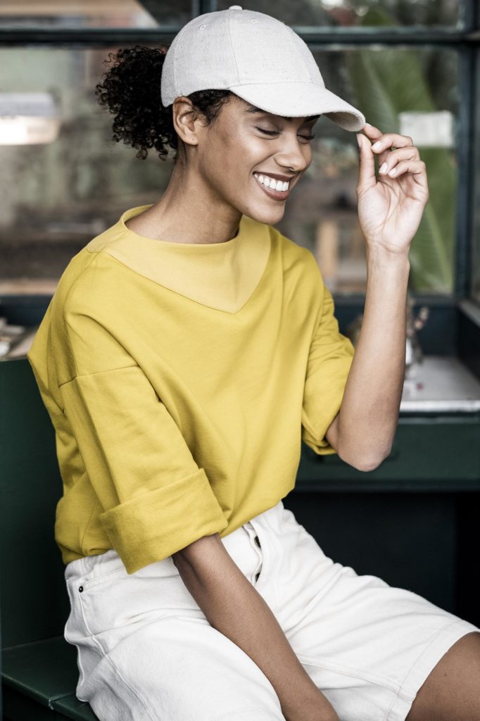 Un tissu maille est parfait pour Vera. Choisissez parmi un tissu à sweat, un tissu à bouclette ou interlock. Coupez le bord encolure dans un tissu bord-côte.