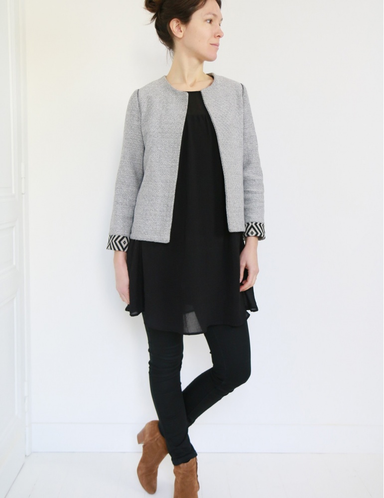 Veste col claudine, épaules passepoil, fermeture zip ou agrafe. Déclinable en semi teddy