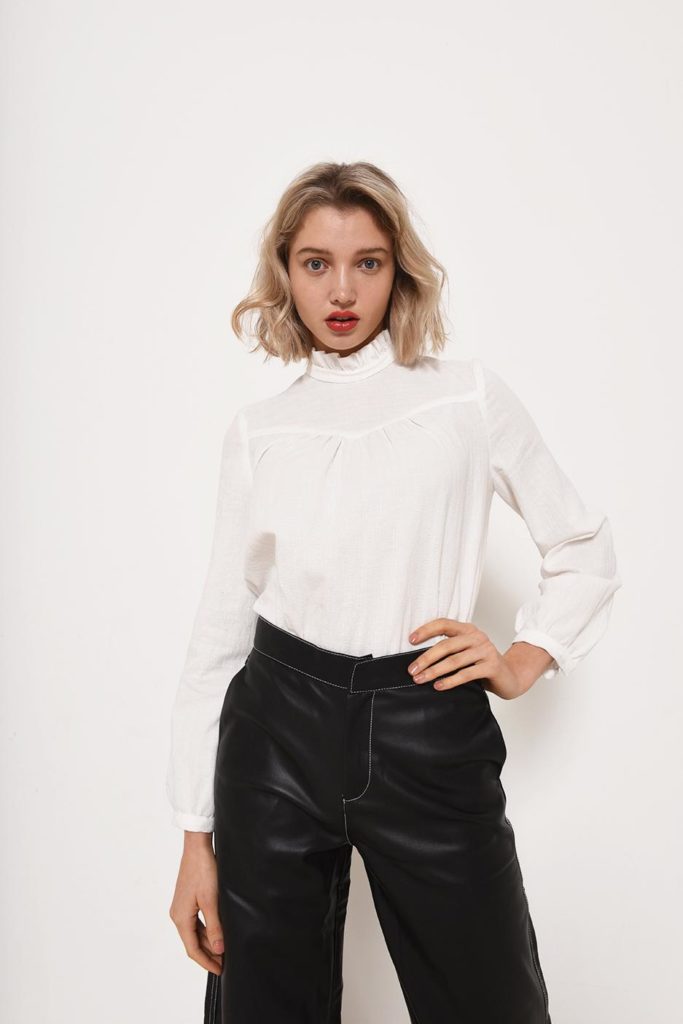 Chemisier victorien avec col montant à volants, manches longues avec manchettes se porte facilement sur un jean boyfriend.