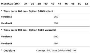 Tissus conseillés pour le tissu principal : coton fin, lin fin, plumetis, voile de coton, seersucker, broderie anglaise fine, viscose, crêpe, soie, tencel, tout tissu léger et fin pour blouse et robe ayant un joli tombé…